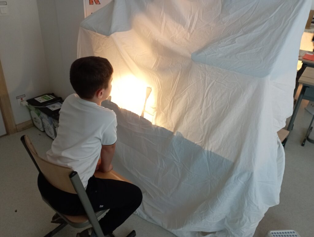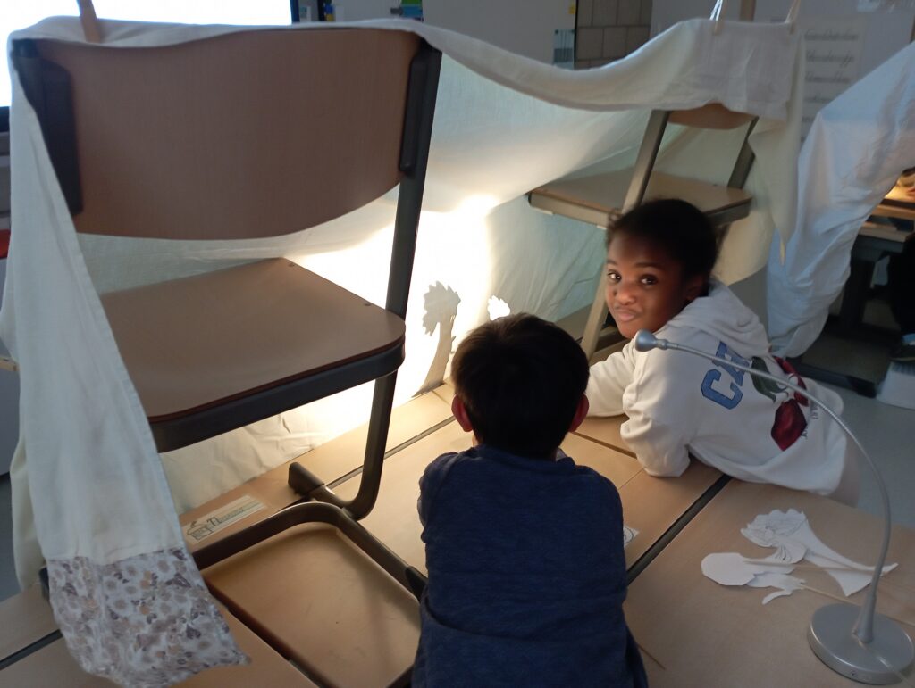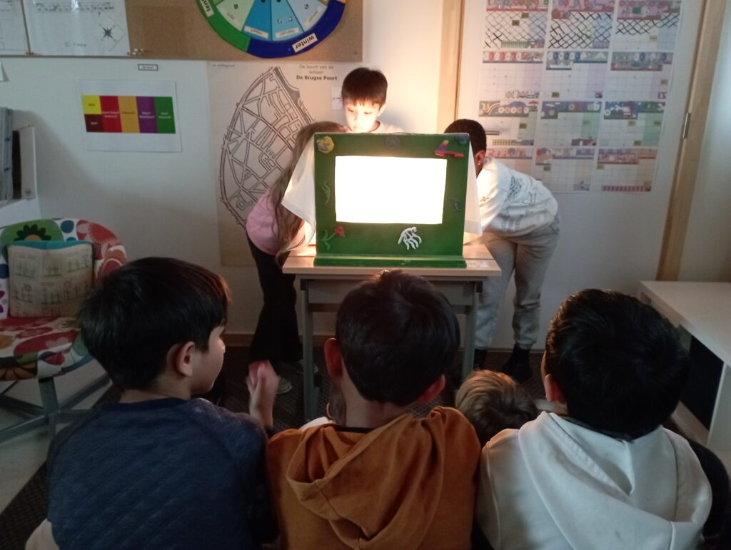 Naar aanleiding van het verhaal ‘De blaadjesdief’, maakten we een schimmenspel. We tekenden de personages en knipten ze uit. Daarna speelden we het verhaal na.